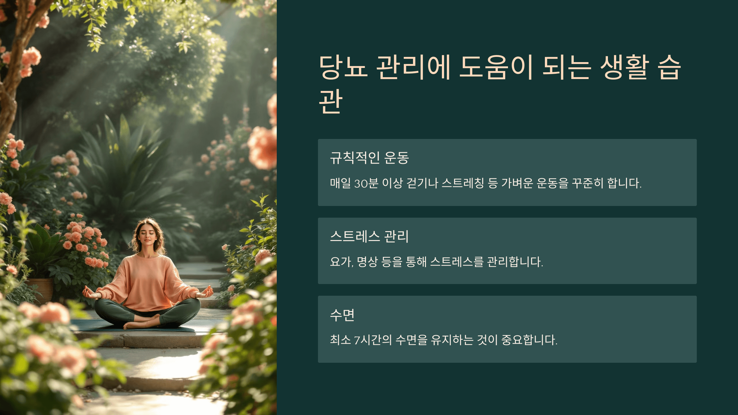 - 스트레스 관리: 스트레스는 혈당에 영향을 미칠 수 있으므로, 요가, 명상 등을 통해 스트레스를 관리합니다.