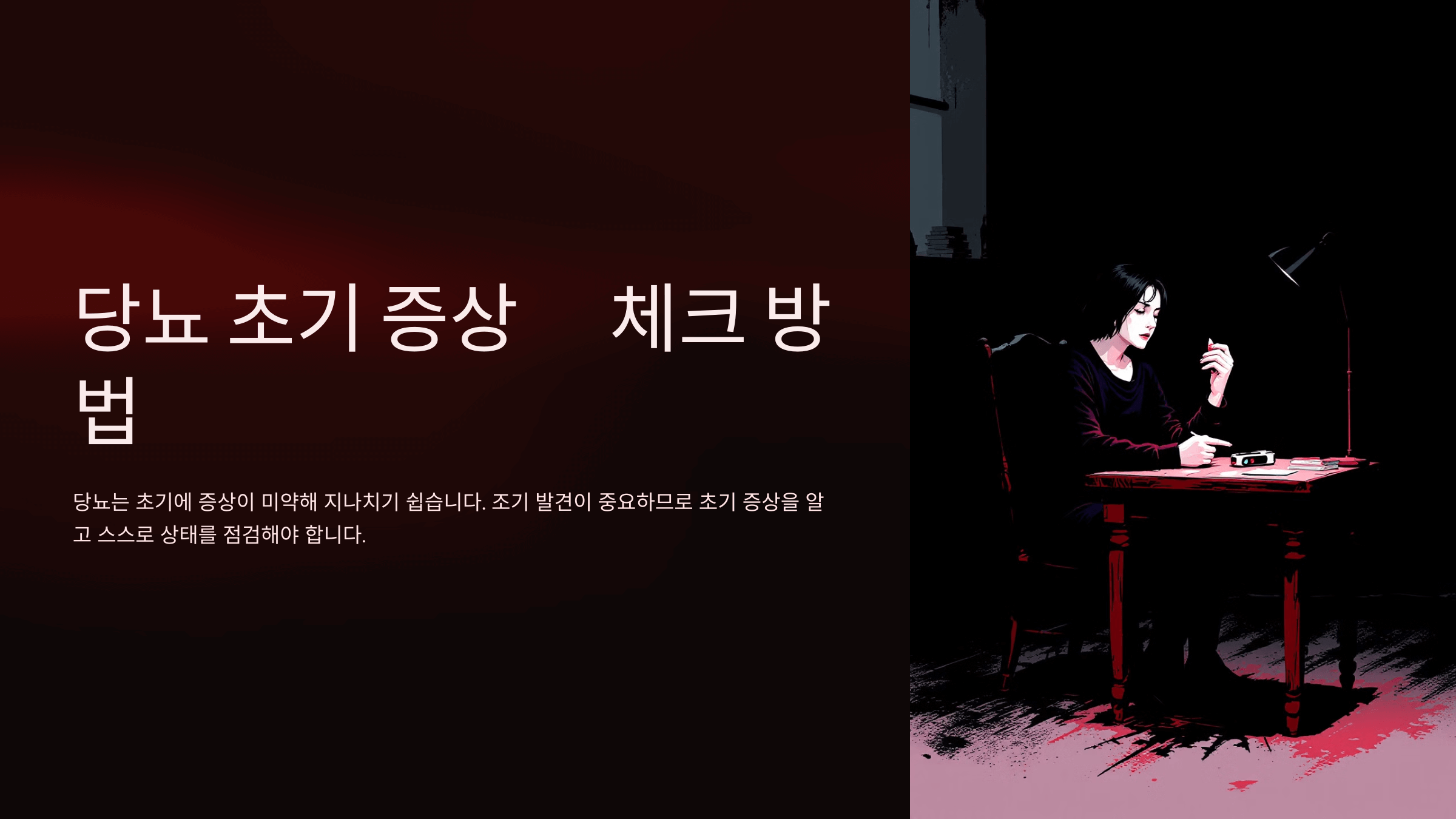 당뇨 초기 증상을 자가 진단하고, 이를 관리하는 것은 장기적으로 큰 효과를 볼 수 있는 방법입니다. 당뇨는 초기에 증상을 느끼기 어려워 발견이 늦어질 수 있지만, 자신의 신체 변화를 꾸준히 관찰하고, 적절한 식습관과 운동으로 관리한다면 건강한 삶을 유지할 수 있습니다. 평소에 작은 증상들을 놓치지 않고, 필요시 전문가의 도움을 받아 빠르게 대처하는 것이 중요합니다.