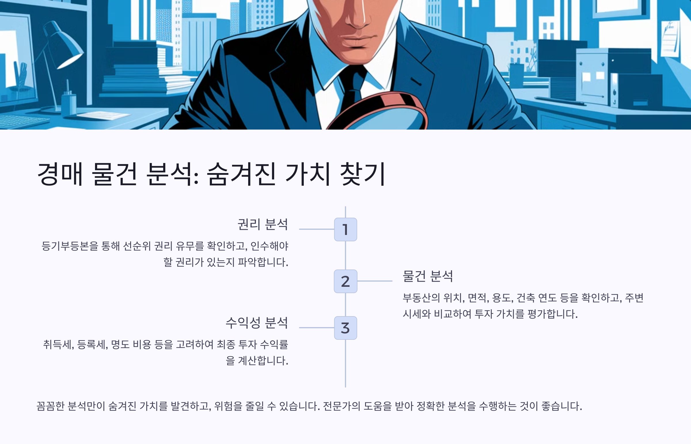 | 3. 숨겨진 법적 문제 | 근저당, 가처분, 유치권 등이 있는 경우 해결이 어려울 수 있음 | 등기부등본과 현장 조사를 통해 권리관계 철저히 분석 |