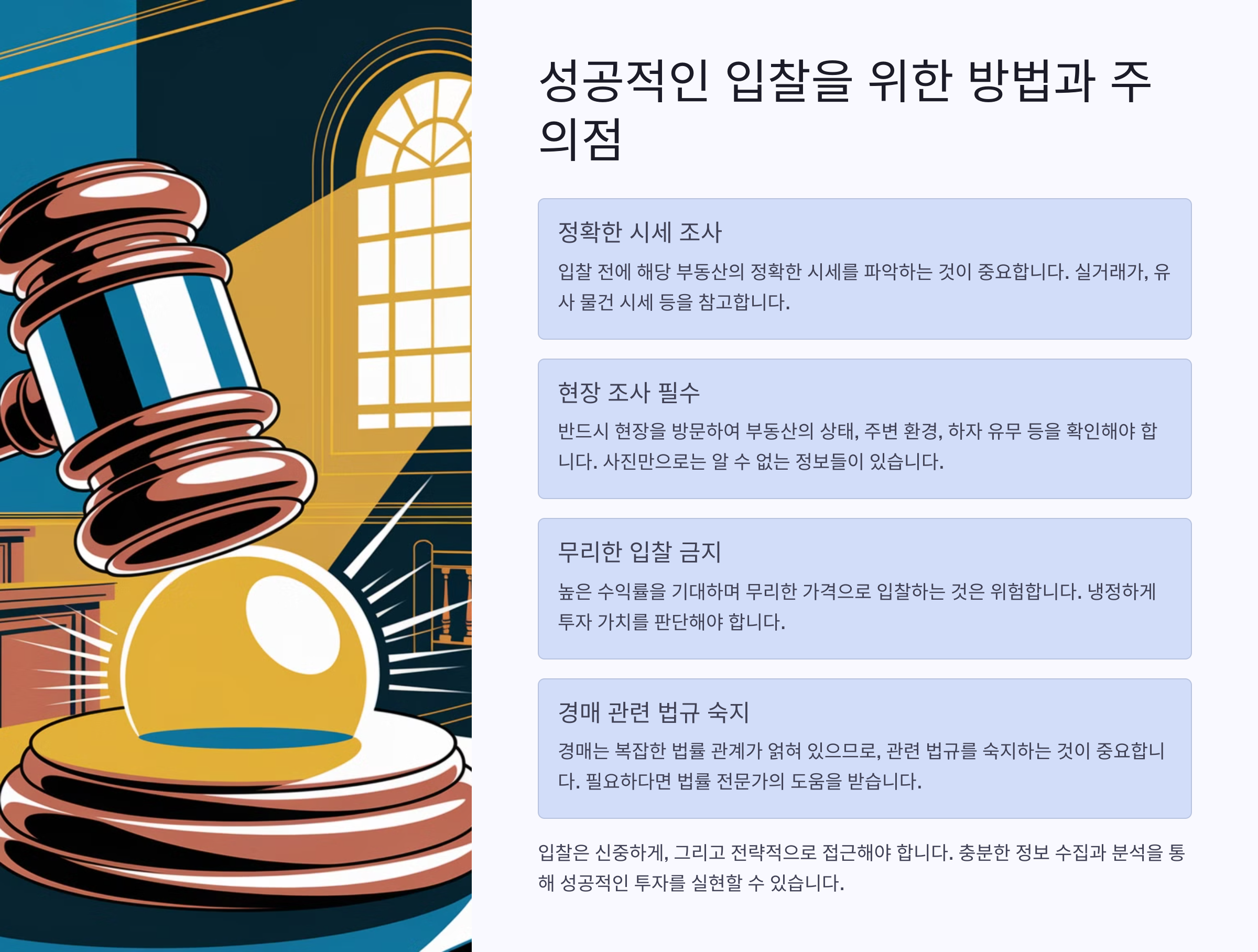 각 단계마다 주의해야 할 점이 있어요. 다음 섹션에서는 입찰 시 주의할 사항을 자세히 살펴볼게요. 🔍