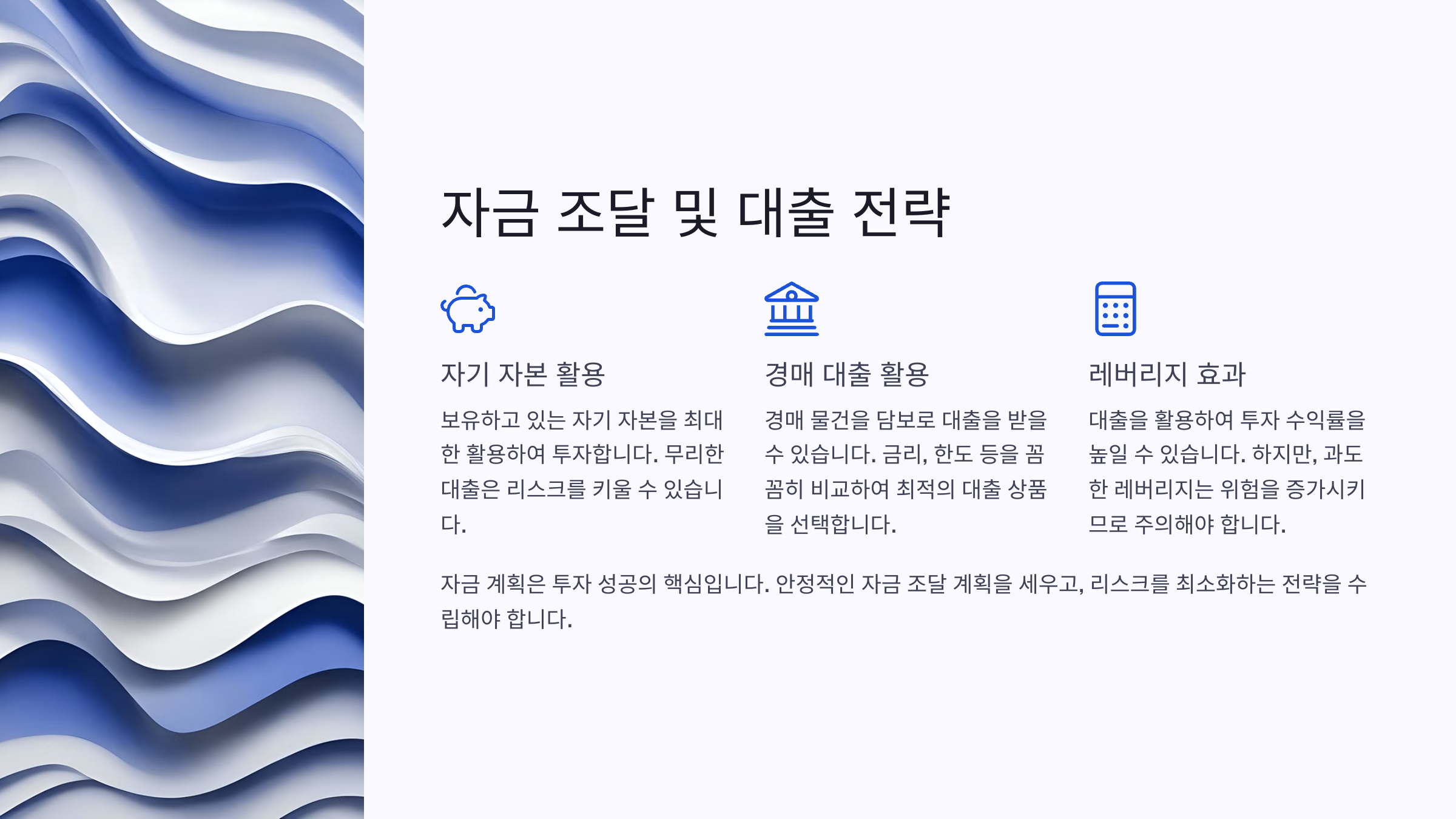 부동산 경매는 현금이 많아야만 할 수 있는 것이 아니에요. 적절한 대출을 활용하면 자금 부담을 줄일 수 있어요. 경매를 위한 대표적인 자금 조달 방법은 다음과 같아요.