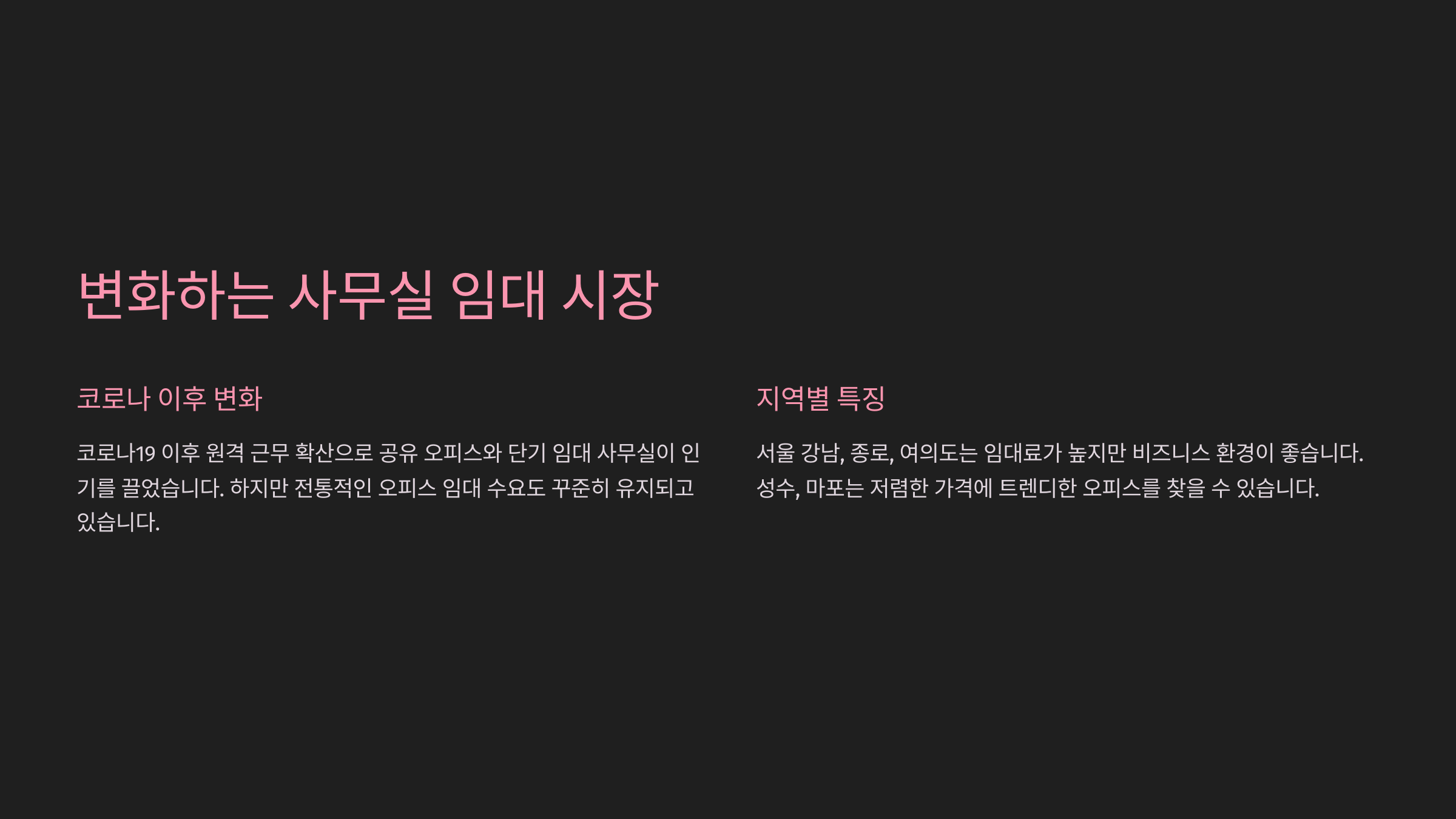 서울 강남, 종로, 여의도 등 주요 지역은 임대료가 높지만, 비즈니스 환경이 좋아 많은 기업이 선호해요. 반면 성수, 마포 등은 상대적으로 저렴한 가격에 트렌디한 오피스를 찾을 수 있는 지역으로 떠오르고 있어요.
