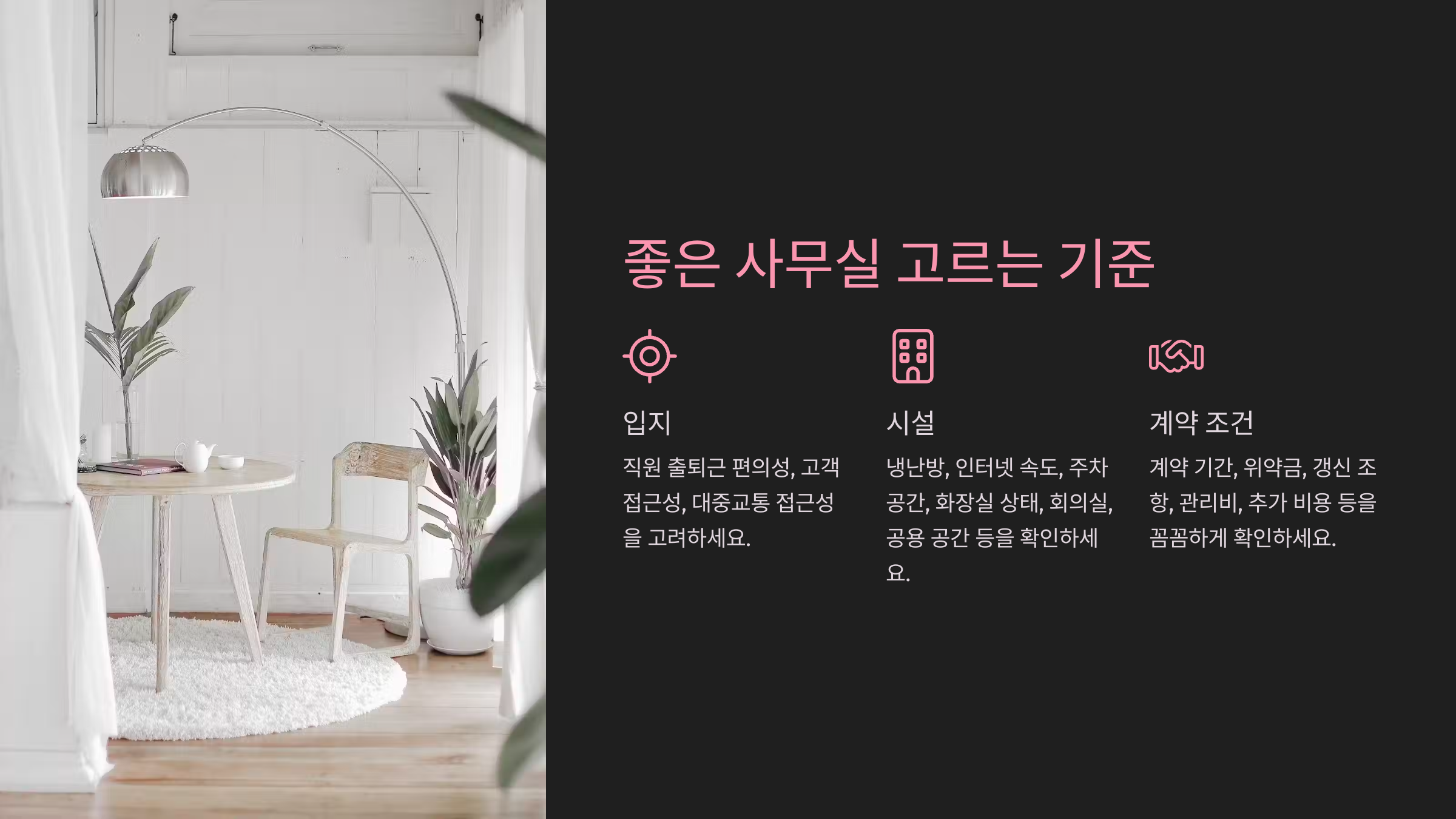 또한, 좋은 사무실을 고르는 기준과 임대 계약 시 꼭 확인해야 할 사항도 함께 정리해볼 테니 끝까지 읽어보세요!