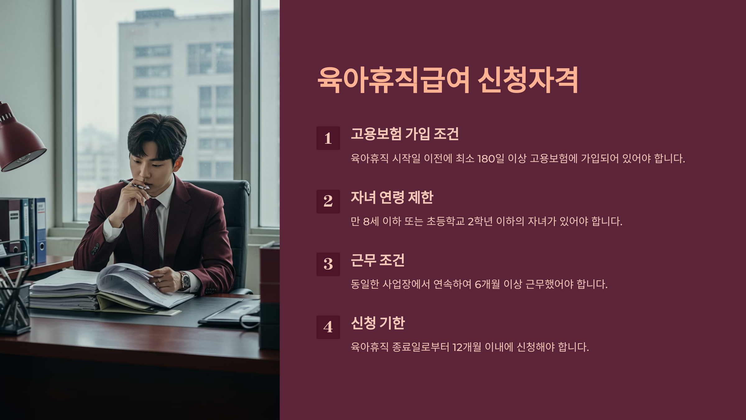 육아휴직급여를 받으려면 일정 조건을 충족해야 해요. 기본적으로 고용보험에 가입된 근로자가 대상이며, 육아휴직을 신청하기 전 일정 기간 동안 근무한 기록이 필요하답니다.