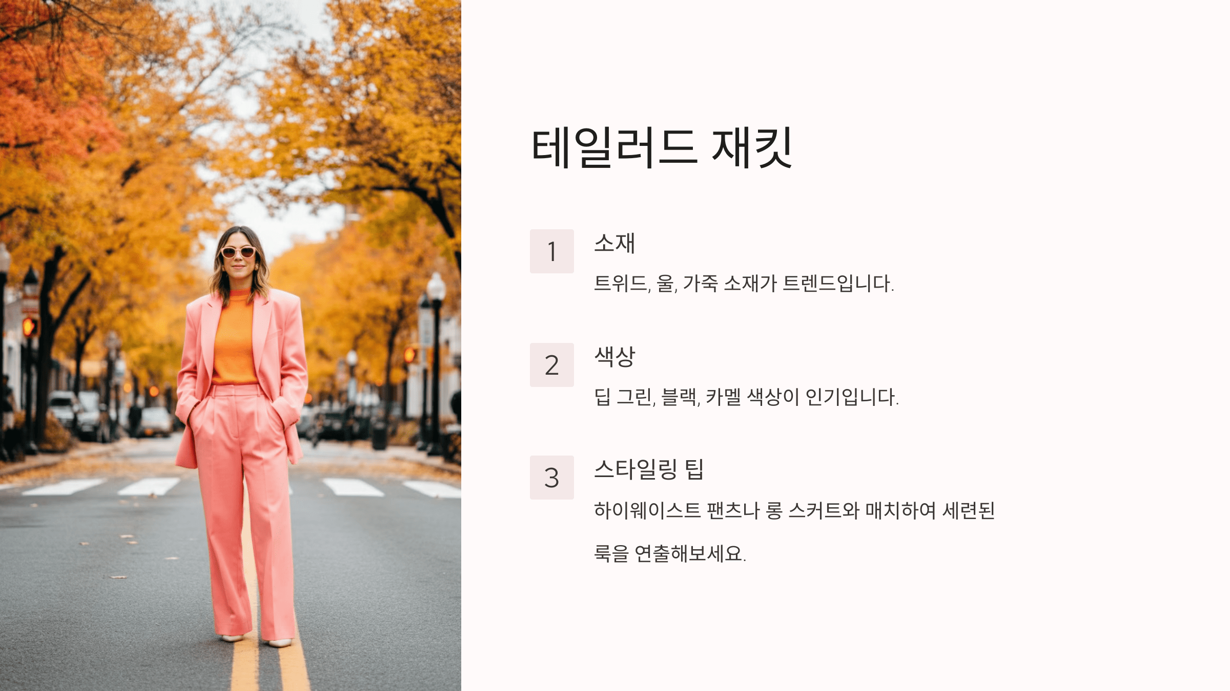 이번 가을, 테일러드 재킷이 다시금 큰 인기를 끌고 있습니다. 재킷은 오피스룩부터 캐주얼룩까지 다양한 스타일에 매칭할 수 있어 실용적이죠. 특히, 오버사이즈 테일러드 재킷은 캐주얼한 느낌을 주면서도 세련된 스타일을 연출할 수 있습니다.