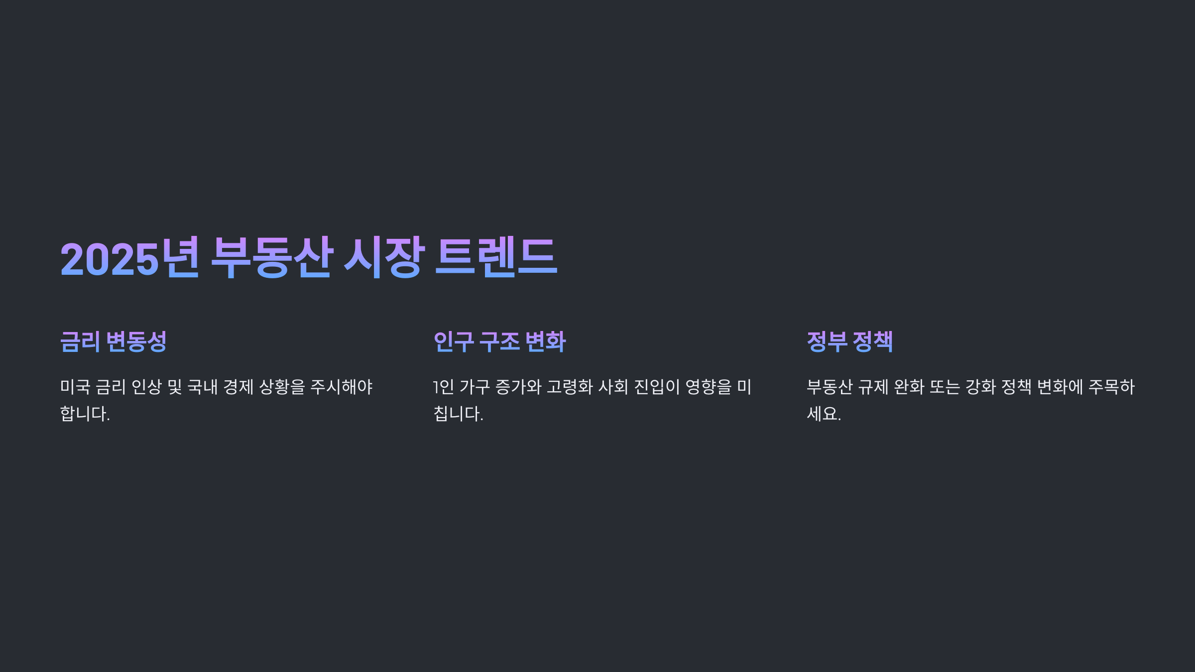 🏡💰 지금까지 2025년 부동산 투자 트렌드와 유망 투자처를 살펴봤어요. 성공적인 투자를 위해 항상 시장 흐름을 주시하고, 신중한 계획을 세우는 것이 중요해요!