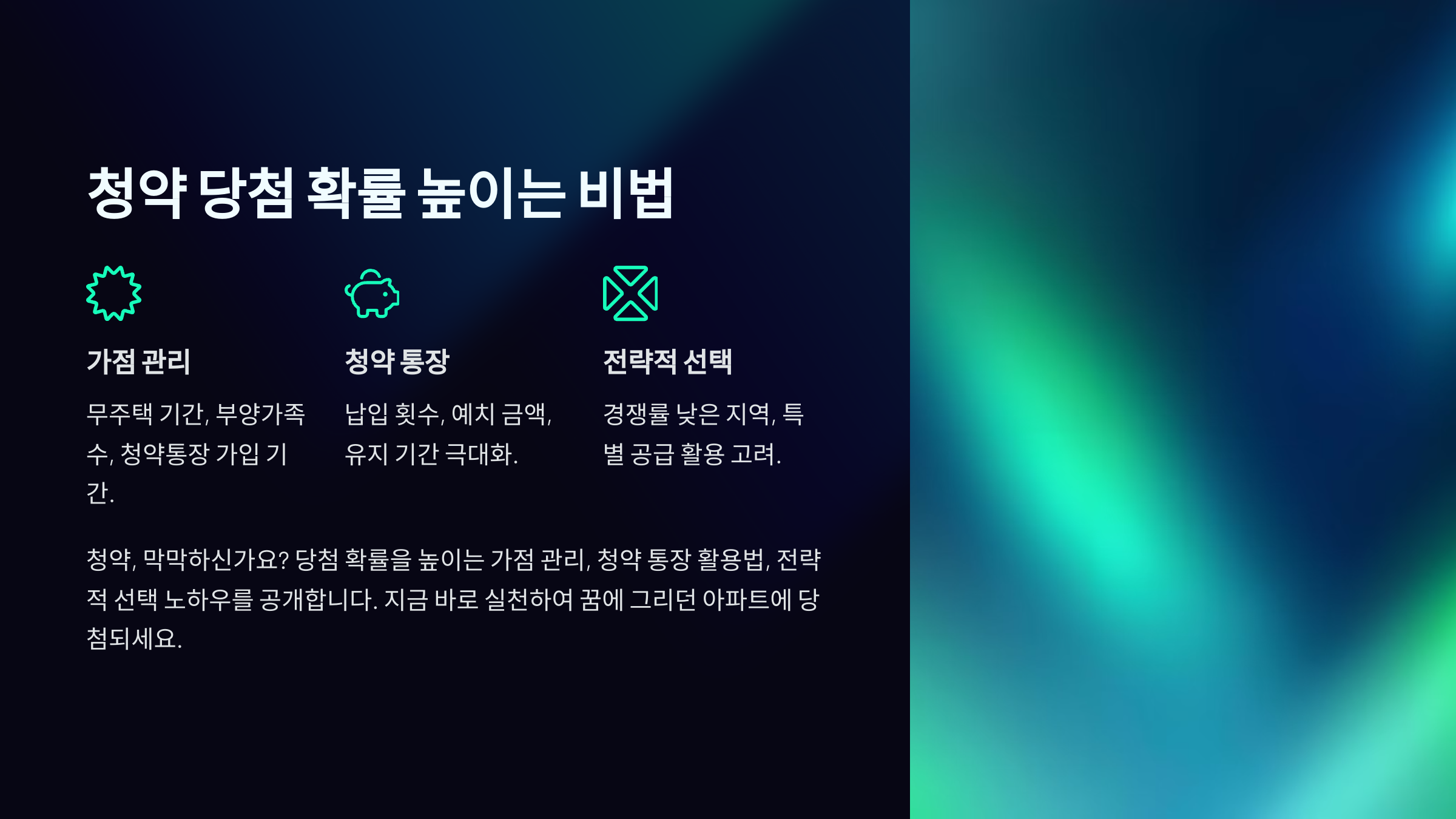 청약에 당첨되려면 본인의 상황에 맞는 전략을 세우는 것이 중요해요. 가점이 높은 사람은 인기 단지를 노리고, 가점이 낮은 사람은 추첨제 물량이나 비인기 지역을 공략하는 것이 유리해요. 🔑